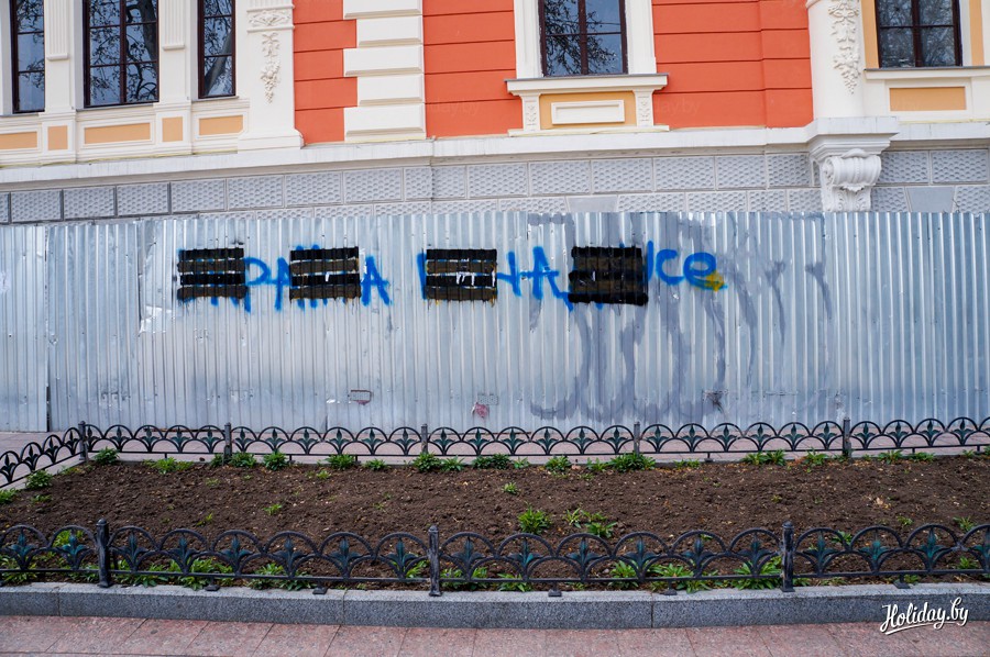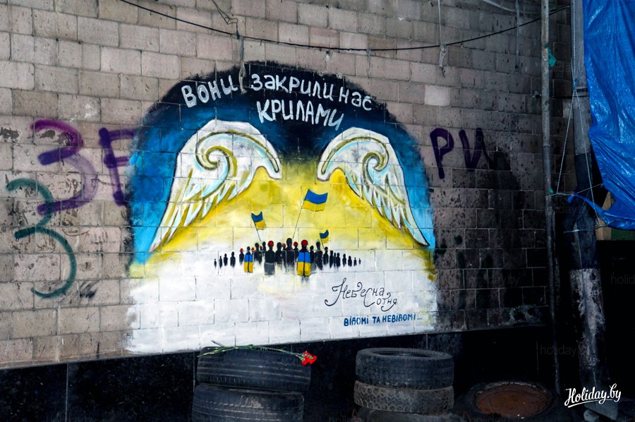На стенах и земле появились граффити и картины, напоминающие о февральских событиях.