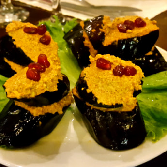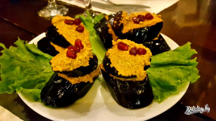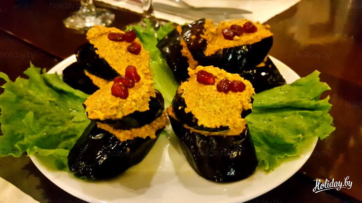 Отлично смотрятся и пробуются баклажаны с острой заправкой и украшением из граната.