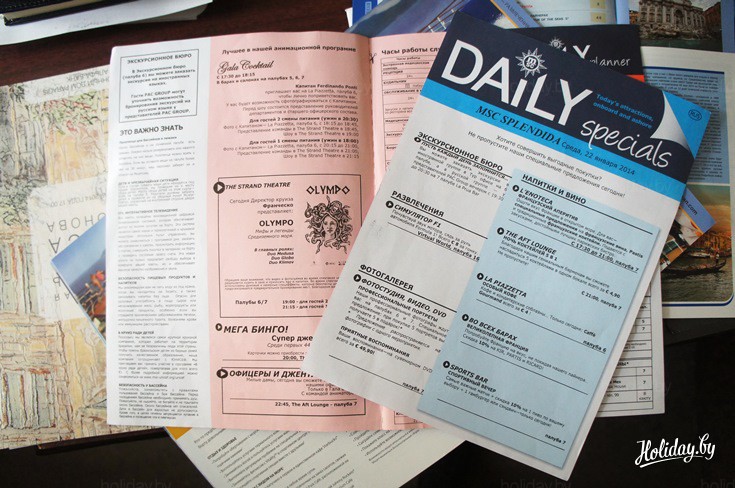 – Во-первых, на лайнере работает компетентный персонал. Есть сотрудники их разных стран, которые говорят на разных языках. Вам легко и быстро ответят на все ваши вопросы. Во-вторых, повсюду развешаны указатели и план вечерних мероприятий. И в-третьих, каждый вечер гости получают буклеты с подробным расписанием всех мероприятий на весь следующий день и могут заранее определиться, где и как они его проведут.
