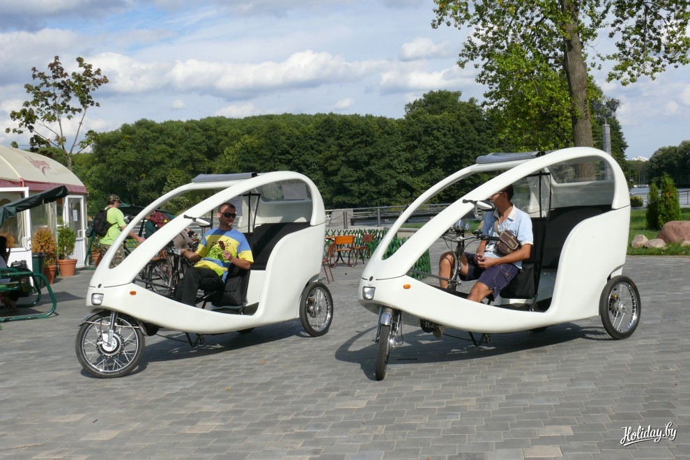 Необычно и интересно на аллеях парка выглядят рикши в Минске. Это такой экологический вид транспорта, вмещающий 2х пассажиров. 10 минут катания в рикше стоит 15,000