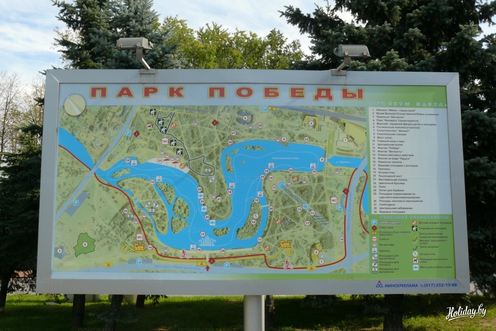 Парк Победы в Минске на Комсомольском озере – одно из самых любимых мест отдыха у горожан и гостей города. Находится он на проспекте Победителей и занимает довольно большую даже по меркам столичного города территорию. Парк Победы – это отличное место для променада, прогулок с детьми и проведения уикенда. Особенно популярен он любителей пеших и велосипедных прогулок, благодаря удобным дорожкам. Их здесь более 25 км пешеходных и почти 3 км велосипедных!