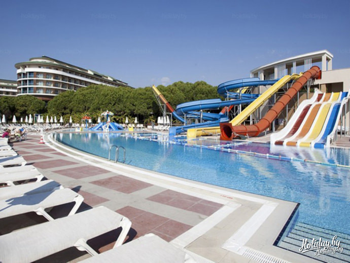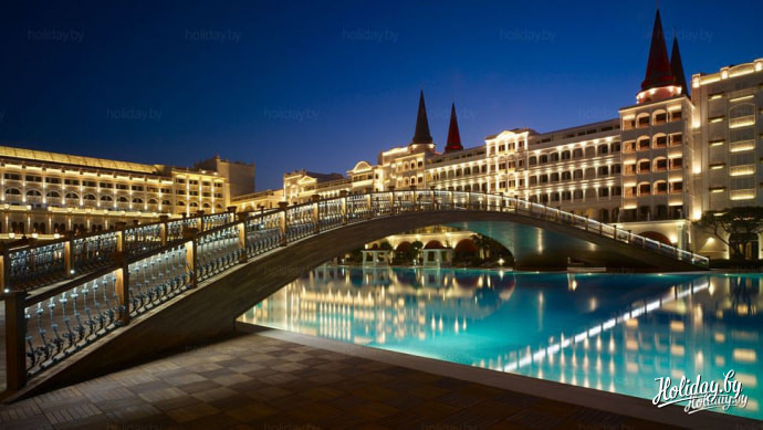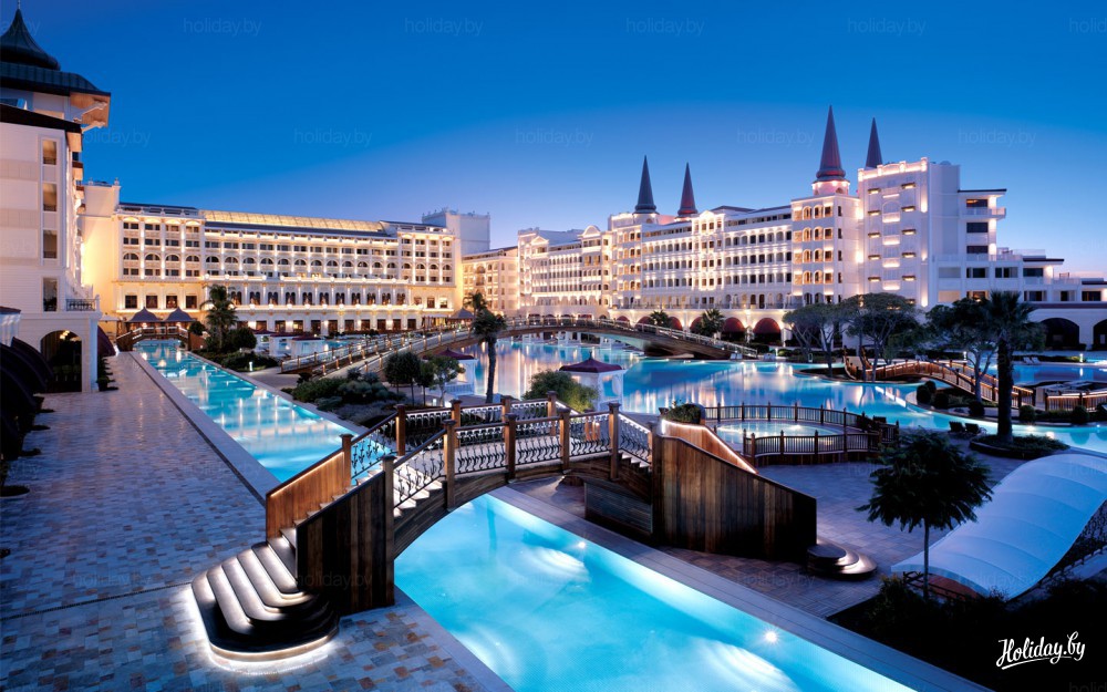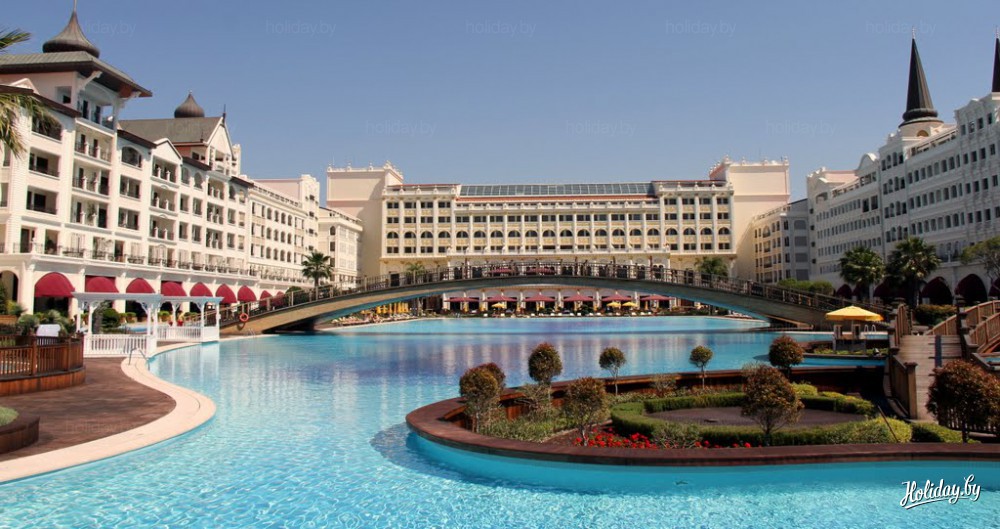 Mardan Palace – отель-дворец, отель-город. Это самый дорогой отдых в Анталье. Его площадь огромна – 195 тысяч квадратных метров. К числу эксклюзива можно отнести гигантский бассейн в центре отеля, через который переброшен мост. Он, по легенде, построен по чертежам Леонардо да Винчи. Водную гладь рассекают пассажирские гондолы.