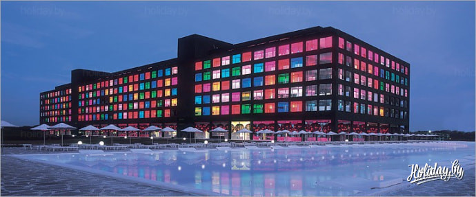 Adam & Eve считается лучшим гостиничным комплексом Белека. Это отель, в котором, по сути, нет окон. Точнее, все стены из стекол – зеркальных, цветных и так далее. А интерьеры – в ослепительно белых тонах. Плюс самый длинный классический бассейн и шикарный бар при нем, а также множество вечеринок и дискотек. Это неклассический шикарный отдых в Турции.