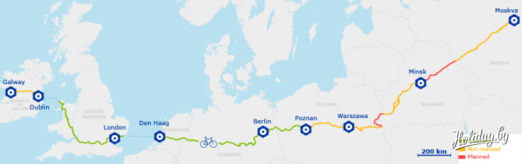 Весь маршрут EuroVelo-2 начнется в ирландском городе Голуэй, пройдет через Дублин (Ирландия), Бристоль, Лондон (Великобритания), Гаагу (Нидерланды), Мюнстер, Виттенберг, Берлин (Германия), Познань, Варшава (Польша), Минск, а также Смоленск и Москву. Люди, которые будут пользоваться этим маршрутом, смогут познакомиться с уникальной природой Беларуси, так как при разработке пути учитывалась и эта составляющая активного отдыха. В настоящее время EuroVelo разработано 14 маршрутов. Предполагается, что сеть будет завершена к 2020 году.