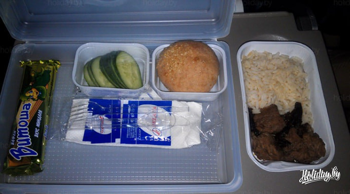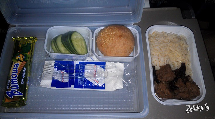 Потом бортпроводники угостят вас напитками, а спустя час – завтраком или ужином (в зависимости от времени полета). Завтрак Belavia менее разнообразный, чем ужин. Горячий омлет, сосиска, булочка и вафля «Витоша» с чаем или кофе порадуют ваш желудок с утра. Вечернее меню «Белавиа» интереснее. Из горячего пассажирам предложат на выбор рис с говядиной или рис с курицей, кофе или чай, соки, булочку и вафлю.