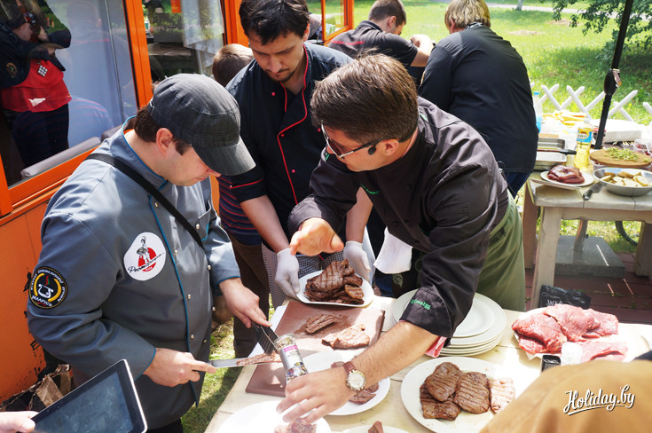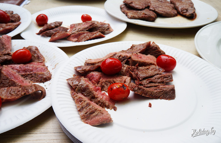Мясо приготовилось довольно быстро, и гости, пленённые ароматами, выстроились в очередь, чтобы попробовать стейки средней прожарки.