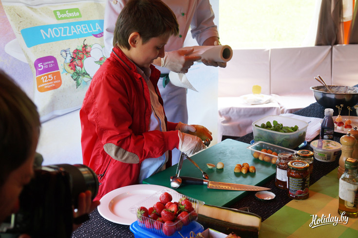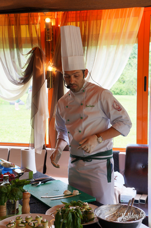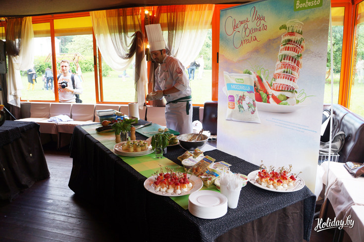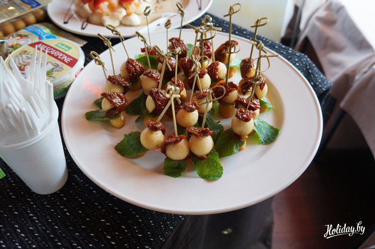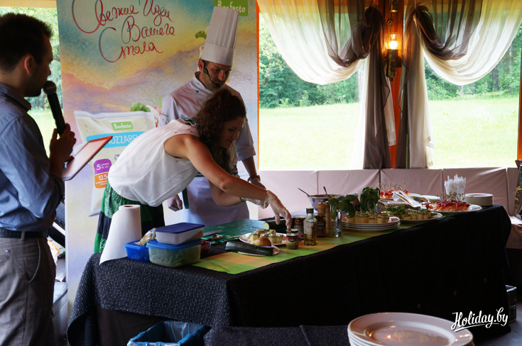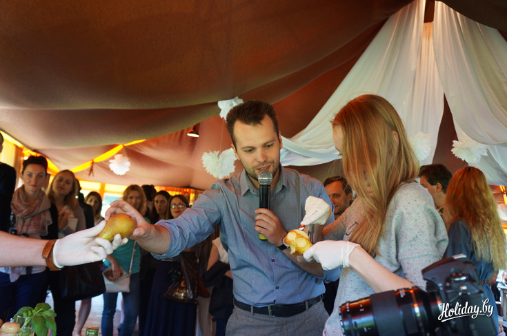 Когда все вдоволь нафотографировались и проголодались, ведущий вечеринки пригласил гостей на мастер-класс по приготовлению закусок для фуршета от бренд шеф-повара ТМ Bonfesto (итальянские сыры, сделанные в Беларуси) Павла Рыжановича.