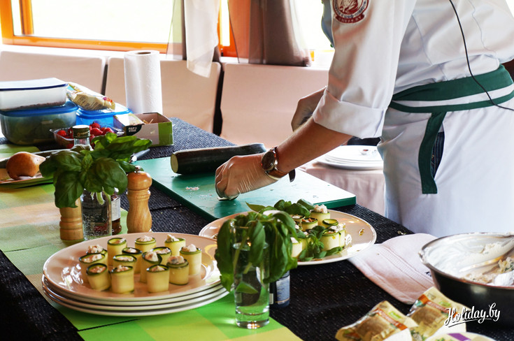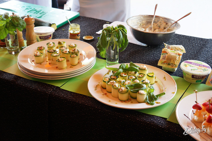 Начинка же была следующей: в сливочный сыр белорусского производства маскарпоне Павел добавил обжаренные кедровые орехи и немного порубленный свежий базилик. Затем он сбрызнул сырые цуккини оливковым маслом, добавил соль и перец и закрутил в эти ломтики начинку. Публика оценила лёгкую и вкусную закуску на все сто.