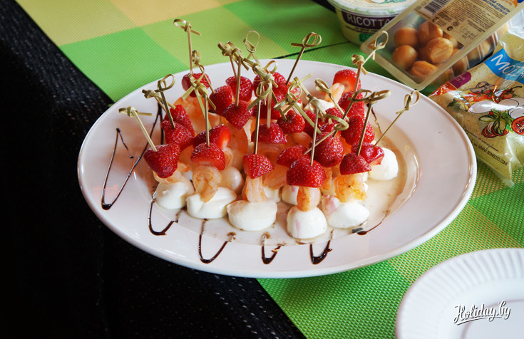 Следующее блюдо было не менее приятным по вкусу и простым. Павел надел на шпажку кружочек моцареллы, затем обжаренную креветку и в завершении – половинку клубники. Вуаля – и отличная закуска готова!