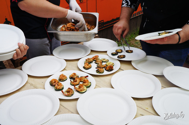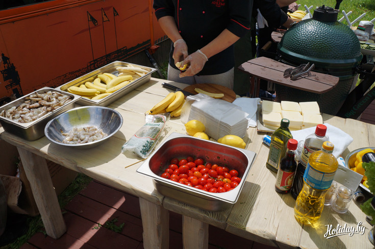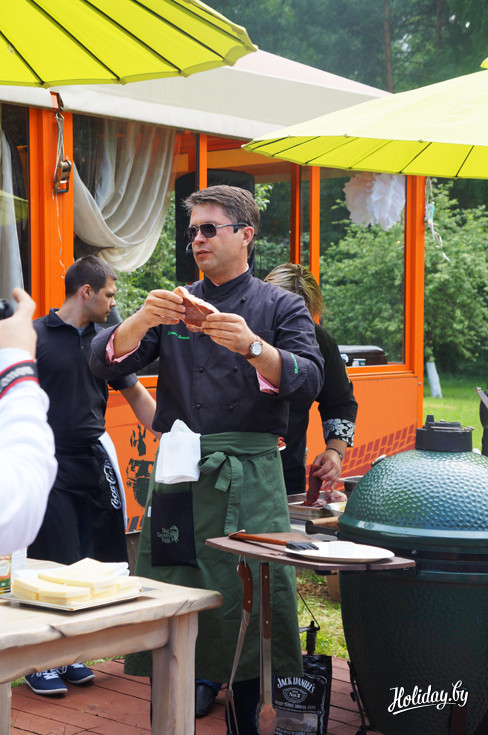 После небольшого вступления повар приступил к приготовлению блюд на гриле. В этом ему помогали шеф-повар пивных ресторанов Bierkeller, «Гамбринус» и «Гвоздь» Александр Чекилевский и шеф-повар ресторана Perfetto Андрей Резников, которые в этот же день успели побывать ещё и на «Сырном фестивале».