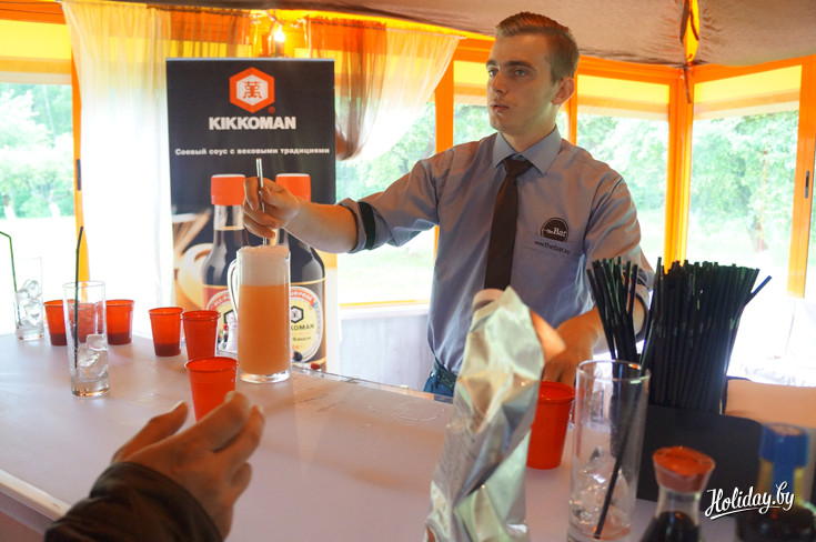 Когда было покончено с закусками, все переместились к импровизированному бару, где ловкими движениями рук умелый бармен готовил безалкогольную «Кровавую Мэри», а потом коптил её с помощью специального устройства. Всё выглядело как настоящая алхимия, а «копчёная Мэри» оказалась весьма необычной на вкус.