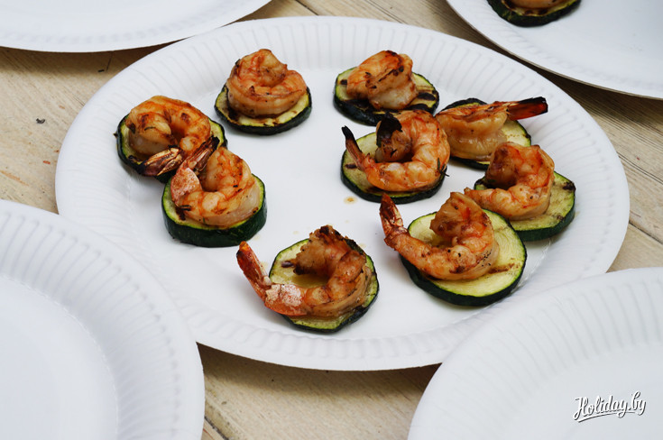 После мяса пришла очередь морепродуктов. Повара приготовили креветки и нарезанные кружочками цуккини в керамическом гриле.