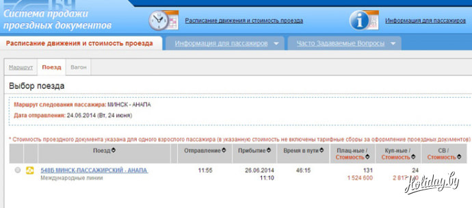 Белорусская железная дорога совместно с ОАО «Российские железные дороги» назначила новый поезд Минск-Анапа. Плацкартный билет стоит 1,5 млн. бел. рублей, а проезд в купе – 2,8 млн. бел. рублей.