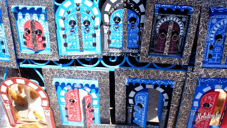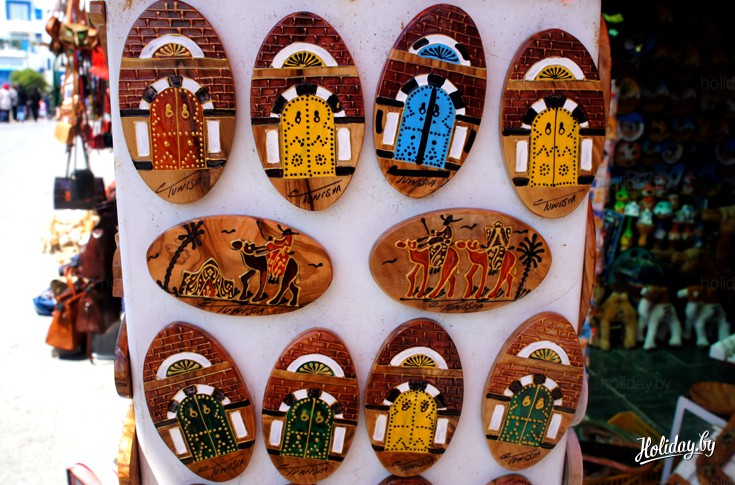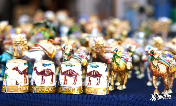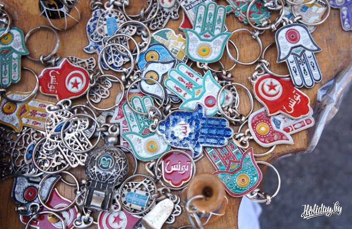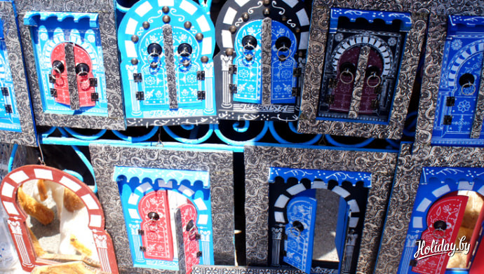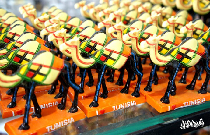 Есть мнение, что фигурка верблюда — национальный сувенир Туниса. Это не так. Здесь принято покупать презенты в форме «руки Фатимы»: брелоки, булавки, статуэтки. Стоит такой амулет «от сглаза» от 3 до 10 динар (от $2 до $6). Есть и еще один национальный сувенир — оберег в виде голубых дверей (символ сине-белого городка Сиди-Бу-Саида). К слову, голубой цвет — это классика. На базарах Туниса множество сувениров с изображением дверей желтого, красного и даже сиреневого цвета. Стоит такое удовольствие от 2 до 20 динар (от $1 до $12).