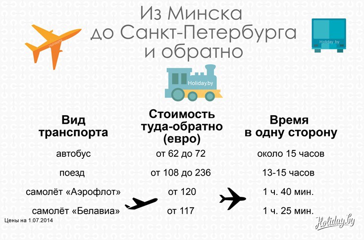 Белорусская национальная авиакомпания «Белавиа» установила минимальную стоимость билета по маршруту Минск—Санкт-Петербург. В культурную столицу России можно долететь за € 69, а вернуться за € 65. Полет туда-обратно стоит от € 117.