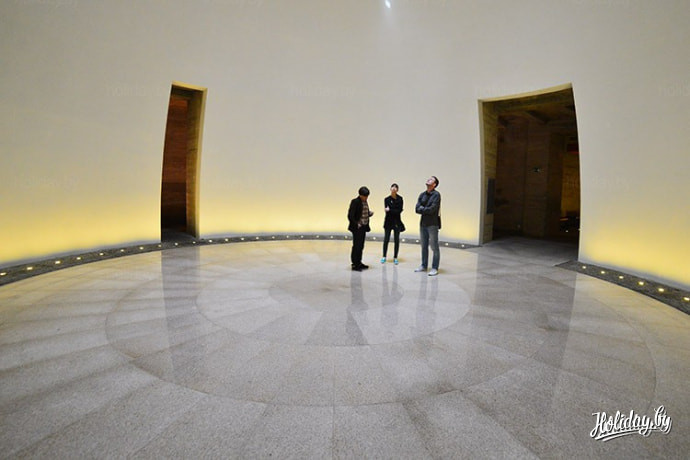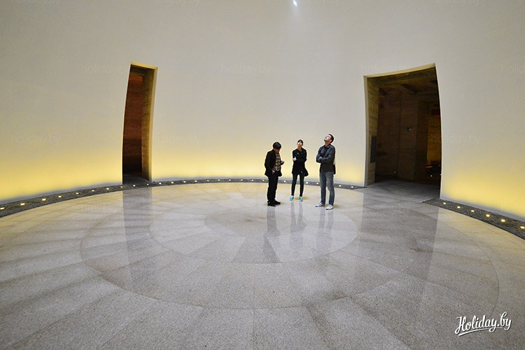 Всепоглощающую тишину разбивает любое минимальное движение, а звуки рассыпаются дрожащим эхом по залу. Под самым куполом, устремляющимся в небо, нарисованы крылья трех птиц. Это символ свободы, отрицающий любое зло.