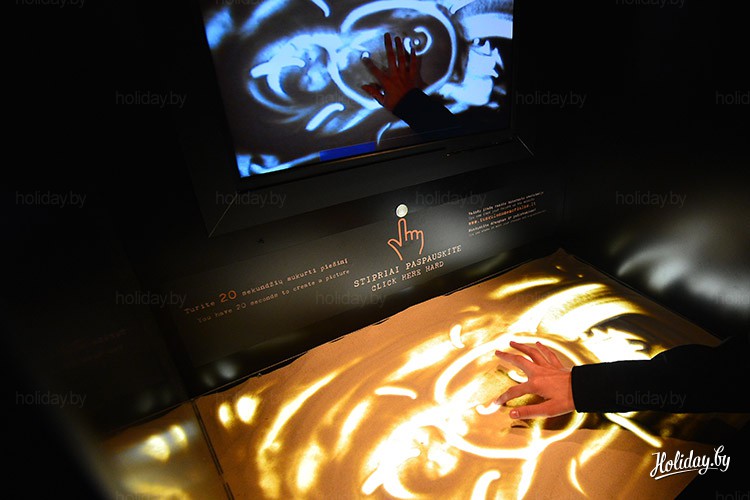 Дальше, тихо шурша выданными нам бахилами, мы перешли к еще одной гордости комплекса. Каждый посетитель может сам подтвердить концепцию музея. У гостя есть 20 секунд, чтобы нарисовать своими руками рисунок на песке. Позже его сотрет другой посетитель, нарисовав свой. Специальная камера снимает процесс создания рисунка и через некоторое время его можно увидеть на официальном сайте музея tuskulenumemorialas.lt.