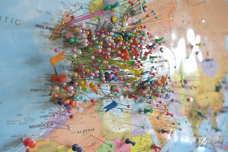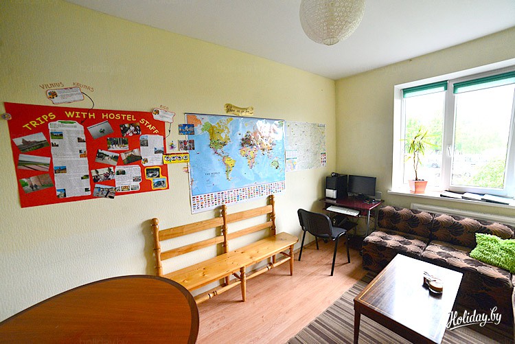 Общая комната — это еще и музей с двумя выставочными зонами. Обе на стене. Первая создана менеджерами заведения. Здесь есть вещи, которые сохранились у хозяев со времен СССР. Вторая зона представляет собой карту с пометками в тех странах, откуда приезжали сюда гости. Найдете вы здесь и рассказы о путешествиях. Если вы в Клайпеде первый раз, и ничего здесь не знаете, не беда — вам устроят бесплатную экскурсию по городу.