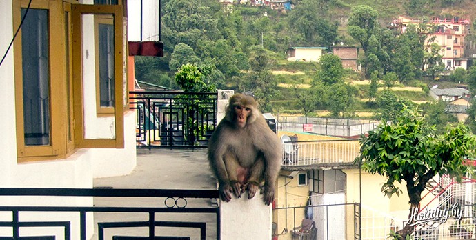 Но когда нас под руки схватил у дверей автобуса хозяин гестхауса со словами: «Я заведу вас в свой отель, он очень дешевый, и из него шикарный вид», мы от холода согласились сразу и не ошиблись. Когда с твоего собственного балкона открывается вид на потрясающей красоты Гималаи, а по соседству живут обезьяны - это даже погоду делает теплее.