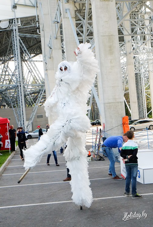 Подходя к арене, мы попали на шоу снежных людей на ходулях, которые зазывали всех посмотреть на необычное зрелище — волейбол на снегу. Правила здесь такие же, что и в обычном волейболе. Единственное отличие — это покрытие поля. Спортсмены в майках, шортах и бутсах бегали по сугробам и пытались не позволить мячу попасть на их территорию. От нескольких падений на подмерзший снег у игроков оставались царапины на руках и ногах, однако игроки этого не замечали и сражались с большим азартом.