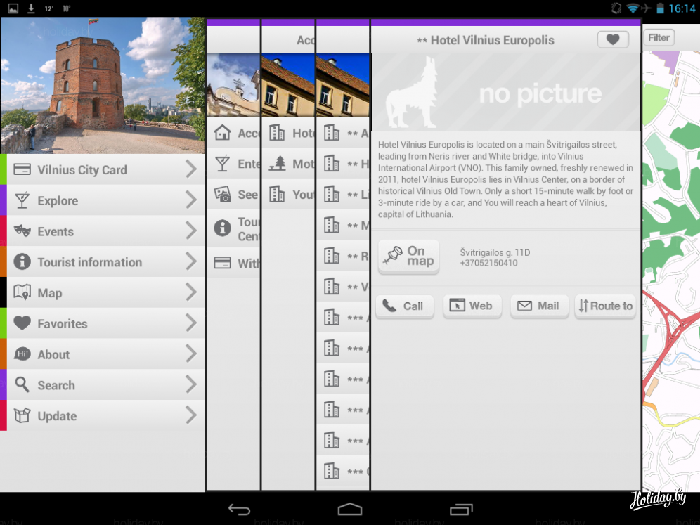Тем, кто хочет увидеть самое-самое, подойдет раздел «Известные места» с группами «Музыкальный Вильнюс», «Церкви», «Старый город». «Мероприятия» — раздел, с которым вам не будет скучно. Выставки, концерты, вечеринки... Минус в том, что описание некоторых из них только на литовском. Догадаться о теме мероприятия можно по картинке или использовать онлайн переводчики.