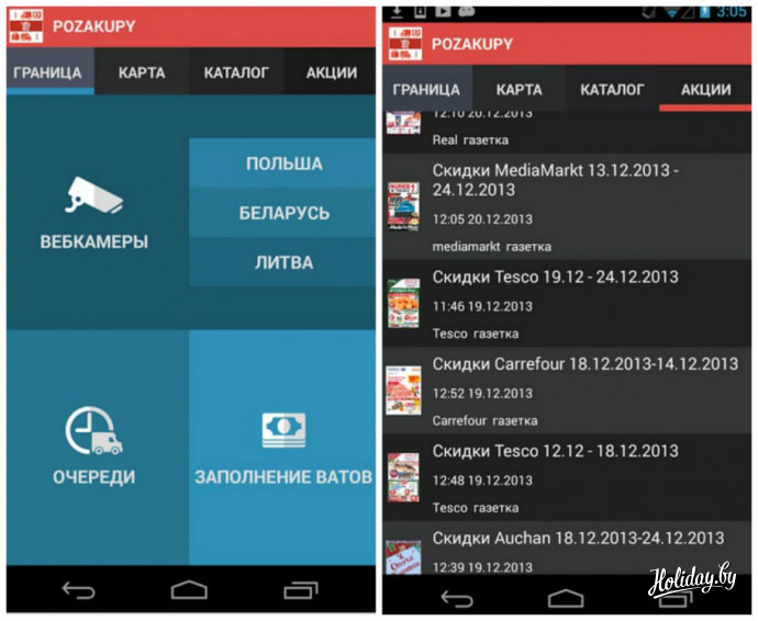 Удобное приложение для автомобилистов и шопоголиков. Во-первых, Pozakupy позволяет в режиме реального времени увидеть очереди на границах с Литвой (видео с вебкамер расположенных около пунктов пропуска в Беларуси и Литве). Во-вторых, в приложении, пожалуй, самый большой список торговых центров и магазинов с адресами.