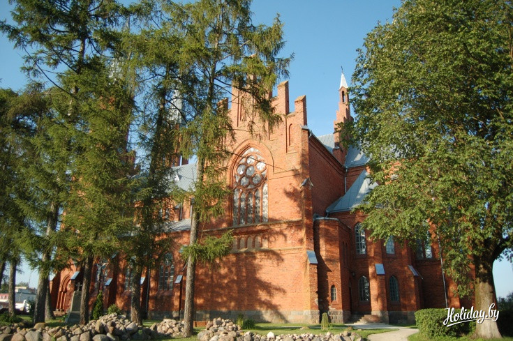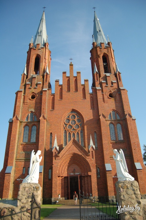 Если в Западной Беларуси нам постоянно встречались старинные костелы, то в местечке Видзы мы обнаружили храм, которому в этом году исполнилось всего сто лет. Костел рождения Матери Божьей построен в стиле неоготика. Устремленные в небо симметричные башни как бы приподнимают костел над землей, а люди рядом с ним кажутся беспомощными букашками.