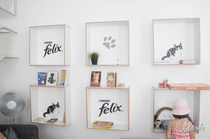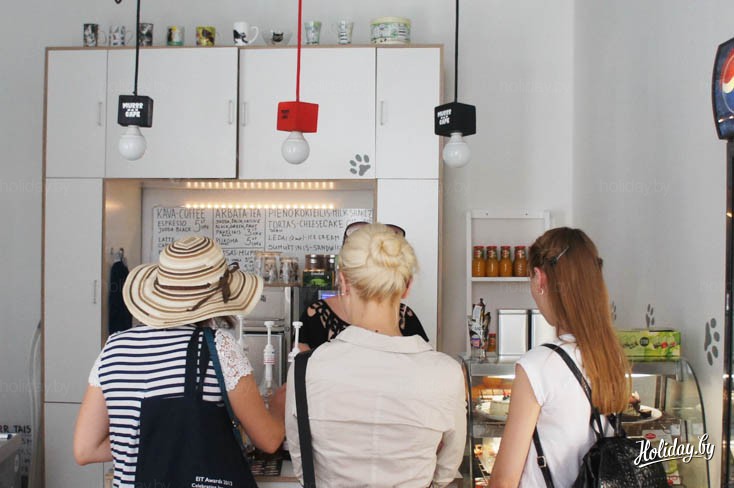 Если долго-долго шагать по улице Pylimo в направлении дома №38, в конце концов, добредете до нужного пункта назначения. Как только увидите на окнах изображения веселых котов — вам сюда. Кафе разделено на две зоны. В одном помещении клиенты делают заказ (кофе, молочные коктейли, мороженное и сладкие десерты), там же располагается и пара столиков. Вторая зона отделена стеклянными дверьми. Именно за ними и находятся владения котов.