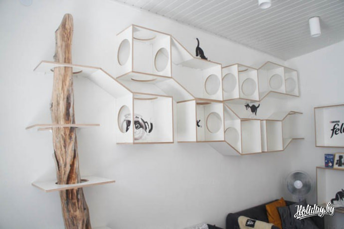 Единственное что напоминает о том, что в помещение за стеклом иногда приходят и люди, это столы и стулья. Остальное — имущество местных обитателей: игрушки, кроватки, лесенки, фотографии и так далее. Коты чувствуют себя полноценными хозяевами территории, реагируют на посетителей снисходительно и спокойно. Всего мы насчитали четыре кота.