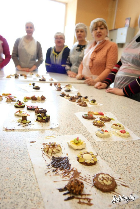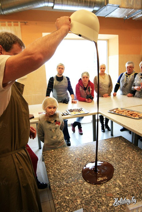 Перед тем, как заливать шоколадные конфеты, гостям с удовольствием продемонстрируют и предложат попробовать сырье. Тем временем шоколад темперируется: выливается на стол и охлаждается лопатками. Позже заливаются формочки, пробуется и вливается крем. Все гости изготавливают конфеты сами, а мы обеспечиваем их одноразовыми фартуками и шапочками. Обычно наблюдателей здесь не остается. Пока залитый шоколад кристаллизуется, проводится демонстрация изготовления трюфелей и других «ручных» конфет. Когда шоколад в формочках застывает, торжественно объявляется дегустация наисвежайшего шоколада. Вначале на мрамор красиво выкладывается блестящее суперновое «поколение» конфет, потом гости приглашаются к столу, и вот тогда уже не остается «нелюбителей» шоколада...