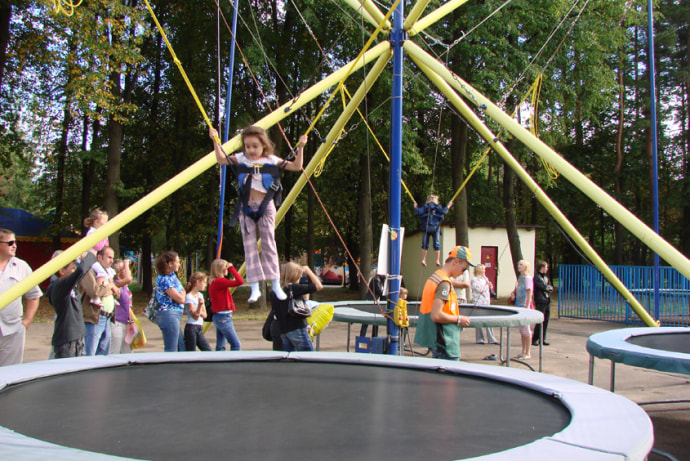 «Кенгуру», дети еще называют этот аттракцион «тарзанка». Это самая дешевая «тарзанка» в городе – 1800 рублей. Но в выходные дни такая очередь, что придется ждать как минимум 30 минут. А если ребенок захочет попрыгать еще раз, то придется окончить первый сеанс, стать опять в конец очереди и ждать своего второго раза. Мы в выходные не смогли достояться, тем более что были очень уставшие. Поэтому предприняли иной ход: приехали в парк в будний день просто ради «тарзанки». Очереди не было вообще, поэтому дочка напрыгалась на год вперед.