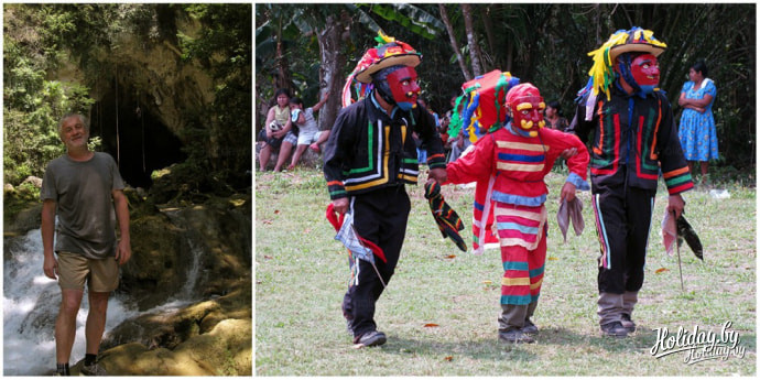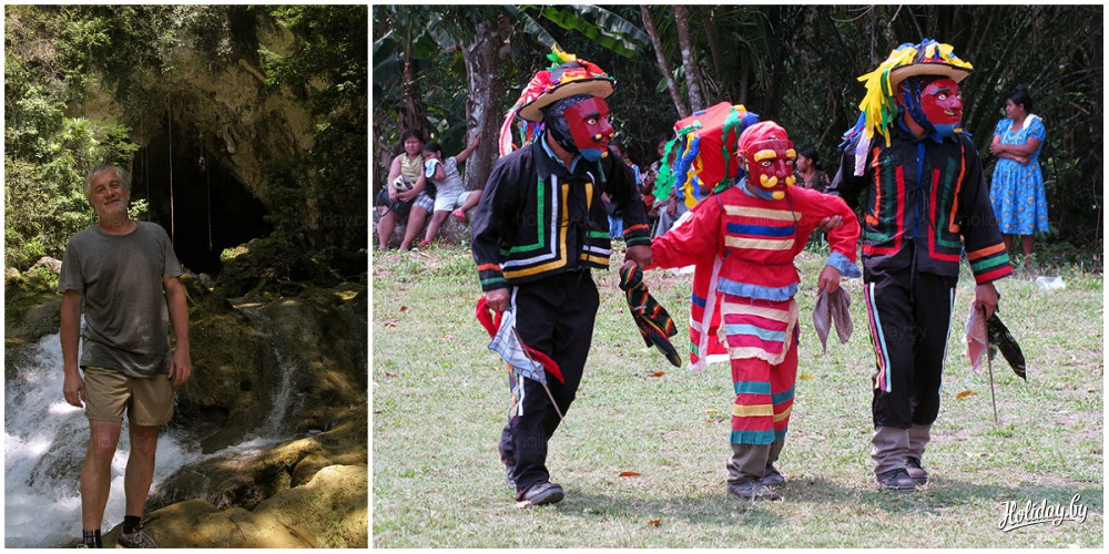 Блю Крик — та самая река в Белизе, где был найден клад (слева). Пятичасовой майанский спектакль, которому пять сотен лет. Завоевание индейцев Кортесом. Белиз (справа). Фото из личного архива Володина.