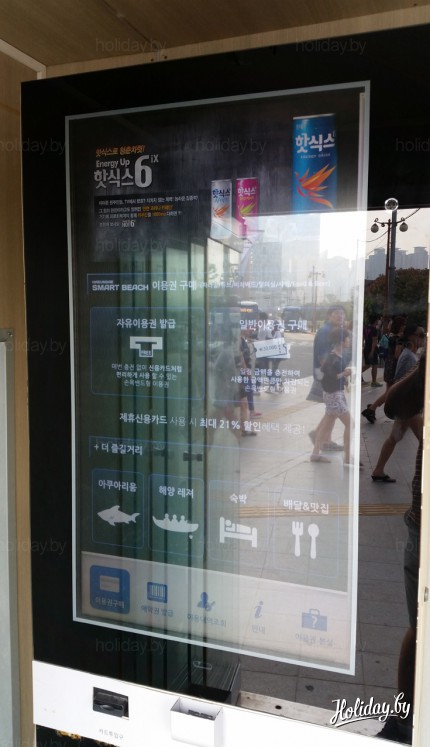 Перед входом на пляж стоит аппарат СмартБич. Подошел к нему со смартфоном, но разобраться не смог, все на корейском.