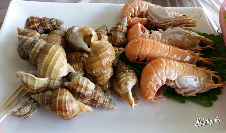 Рядом с пляжем есть торговые ряды с живыми морскими гадами.