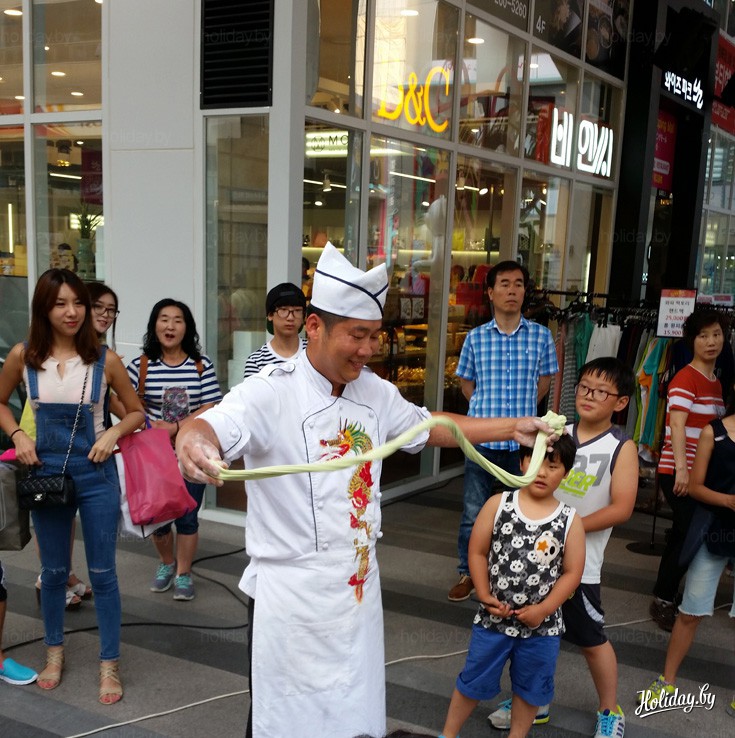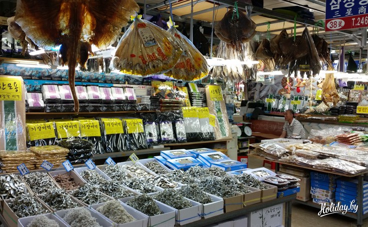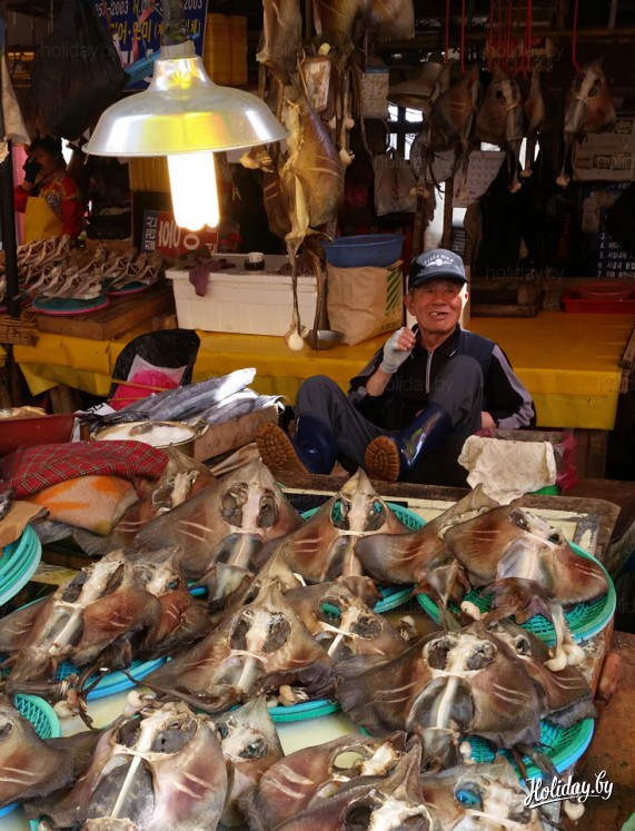 Cкоростной поезд из Сеула пролетает 350 километров за пару часов. Первым же делом отправляюсь на рыбный рынок. Он находится недалеко от вокзала: всего пара остановок на метро. Под землей почти все по-корейски, билет помогал покупать «специальный» дедуля.