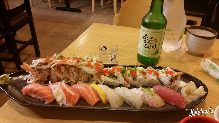День закончился снова сырой рыбой и бутылочкой соджу. Корейская водка похожа на сакэ. Только не говорите об этом корейцам!