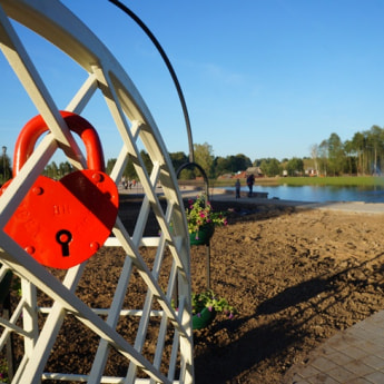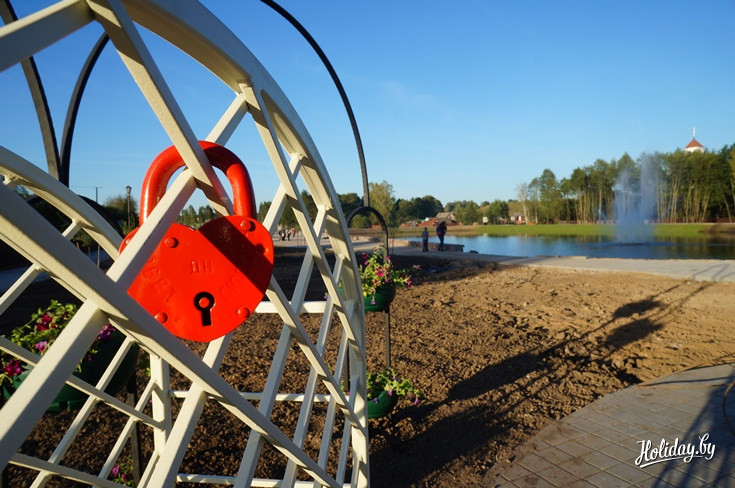 Рядом с ним появилась скамейка, обрамленная железной конструкцией в форме сердца и специальная решетка для замочков, которые будут оставлять свадебные пары. Общий вид немного портит строительный мусор и рабочие, которые в спешке доделывают тропинки вокруг пруда.