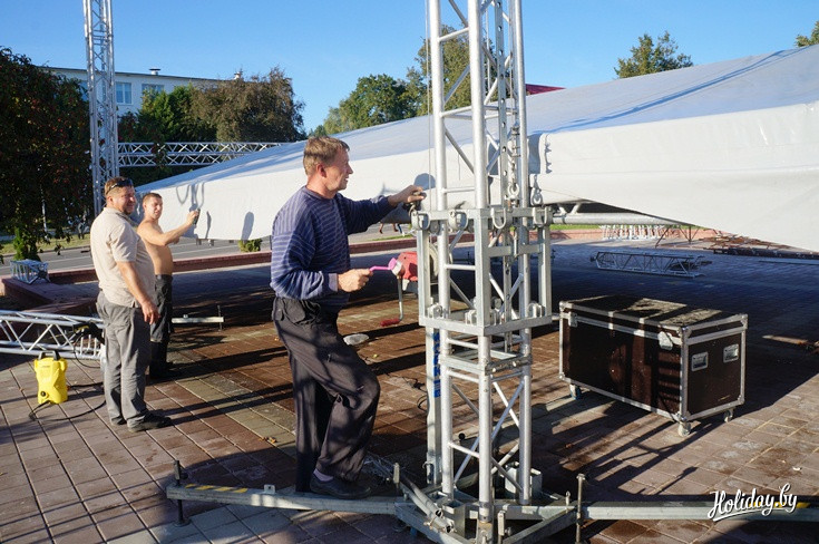 Сегодня, за день до торжества в Заславле устанавливают последние скульптуры, завершают благоустраивать детский парк культуры и отдыха и готовят сцены для артистов.