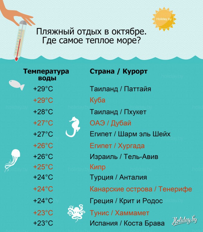 Белорусская осень набирает обороты, но ничто не мешает вам купить один, два или три билета в лето. Тем более, что в ОАЭ, Египте и Израиле дневная температура колеблется в районе +30 и +35 градусов. Holiday.by узнал, где самое теплое море в октябре.