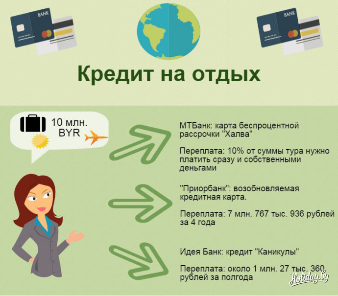 Некоторые уверены, что влезать в долги ради двухнедельного удовольствия на берегу моря не стоит. Других мучают вопросы, насколько тяжелым бременем окажется кредит и легко ли будет его отдавать. Есть и те, кто не знает, где дают кредиты на отпуск. И если на морально-этические и финансовые вопросы каждый должен ответить себе сам, то в том, где и какой кредит на отдых взять, поможет обзор Holiday.by. Разбираясь в вопросе, мы побеседовали с минскими банками и некоторыми турагентствами.