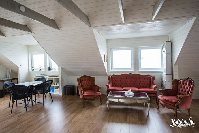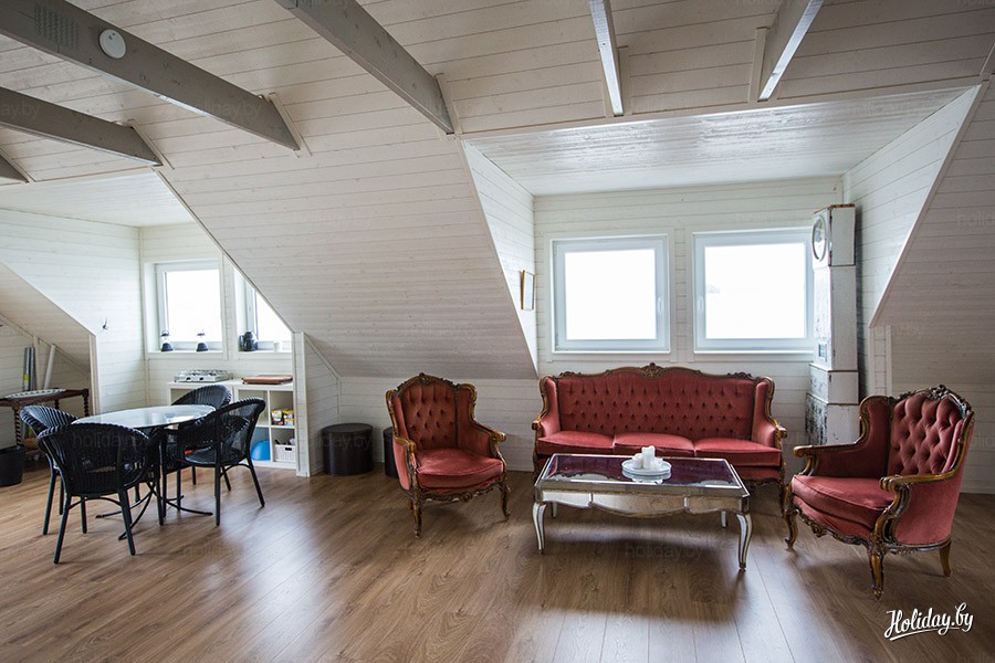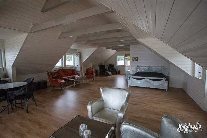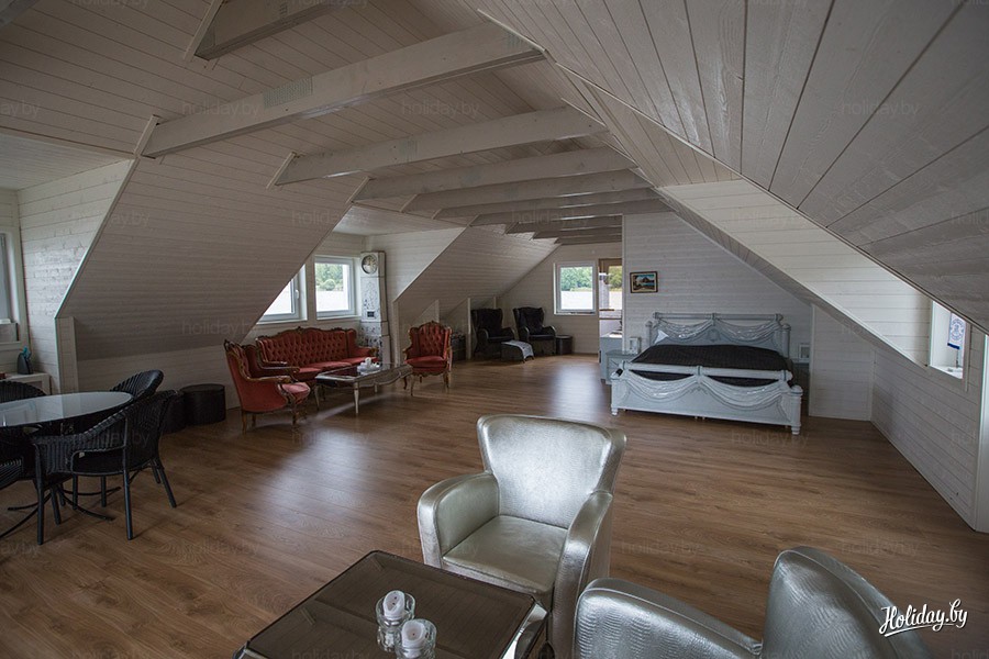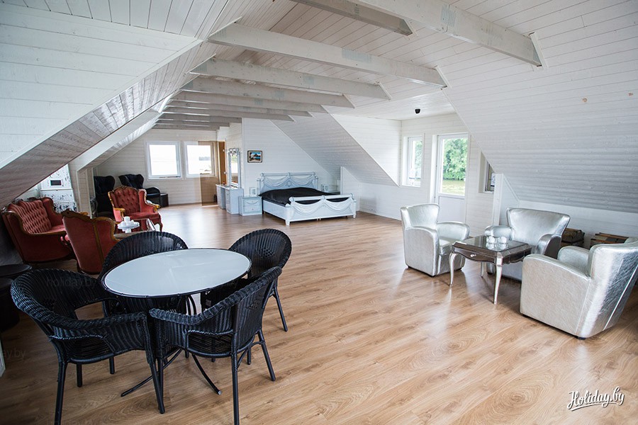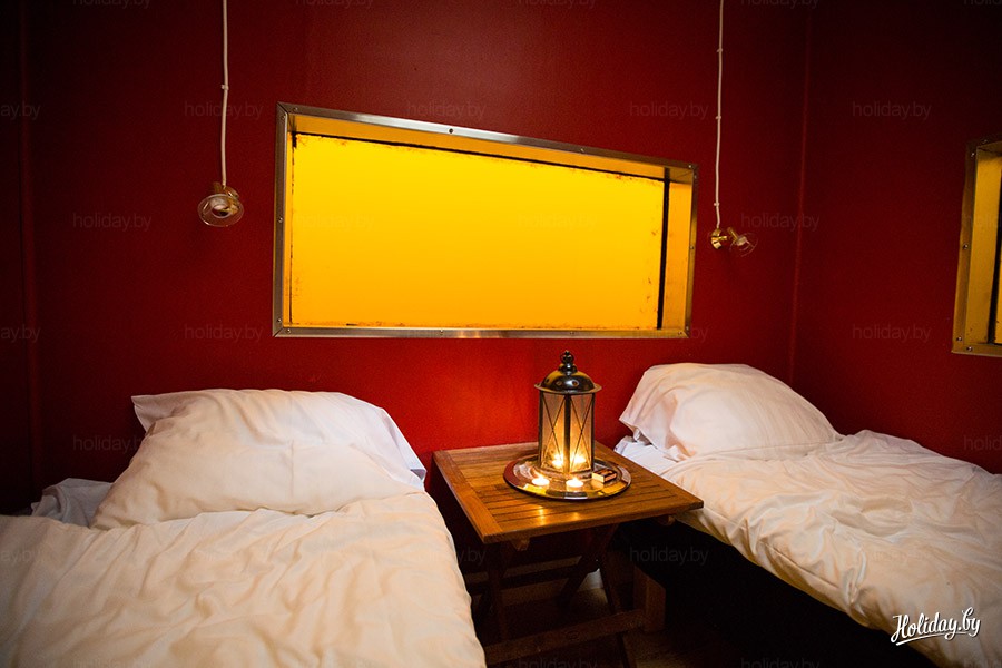 Внутри места гораздо больше, чем в предыдущем творении Генберга. Дом условно разбит на несколько номеров-зон, каждая из которых сделана в своем, неизменно шикарном, стиле. Здесь кроме уборной и кухни (на которой плита, холодильник, посуда и 10 литров питьевой воды) есть сауна. Попариться и сразу в озеро — излюбленное белорусами времяпрепровождение. В отеле нет электричества. Тепло в сауне обеспечивает дровяной камин, а лампы работают от солнечной энергии.