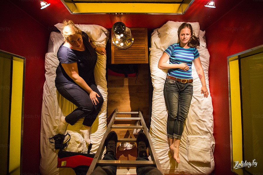Пока я рассматриваю берег, наш проводник открывает дверь отеля и приглашает нас внутрь. Точнее, на глубину. Спускаюсь по металлической лестнице и оказываюсь в довольно тесном помещении. Две аккуратно застеленные кровати, тумбочка со свечами между ними, четыре окна. Пока я наблюдаю за рыбками, плавающими прямо за окном, Петер убирает лестницу и закрывает люк…