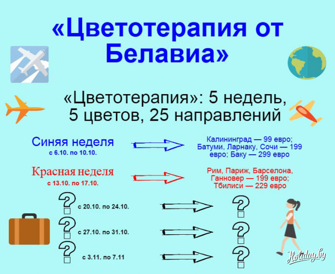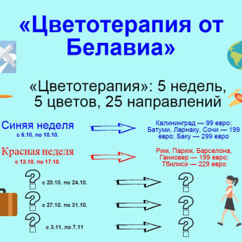 Как рассказала Holiday.by специалист по связям с общественностью Ирина Баранова, акция «Цветотерапия» от Белавиа будет длиться до 7 ноября. Купить билеты со скидками можно на протяжении 5 недель по 5 разным направлениям. На вопрос о том, какой будет следующая неделя, Ирина Баранова сказала, что Белавиа хочет сохранить интригу.