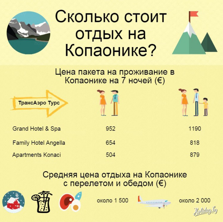 Как видим, горнолыжный курорт Копаоник предлагает широкий выбор цен и условий для жизни. Стоимость номеров зависит от дат отдыха и выбранного отеля. Однако каждая из гостиниц MK Mountain Resort выделяется отличными условиями жизни и массой специальных предложений для постояльцев. Чтобы еще яснее представить, во сколько обойдется отдых на Копаонике, нужно прибавить к ценнику за жилье стоимость обедов и затраты на развлечения. Как правило, это минимум 50% от пакета. Кроме того, нужно учесть, что перелет из Минска до Белграда и обратно обойдется в сумму около 250 евро. Трансфер из Белграда до Копаоника будет стоить около 260 тысяч белорусских рублей.