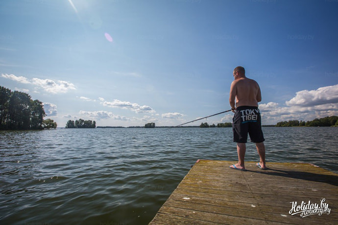 Мы бредем по берегу озера, наш фотограф видит на пирсе одинокого рыбака и бежит к нему попытать счастья и заснять улов. Мужчина желания фотографироваться не проявляет. Рыбы тоже пока нет…