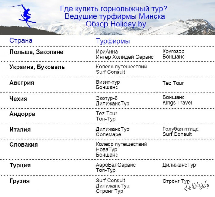 К выбору горнолыжного тура надо походить с особой ответственностью и покупать только у компаний, специализирующихся на этом виде отдыха. Holiday.by собрал в одном обзоре ведущие турфирмы Минска, которые предлагают горнолыжные туры, и узнал сколько будет стоить поездка в сезоне 2014/2015.