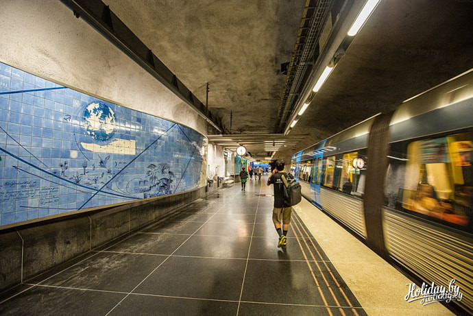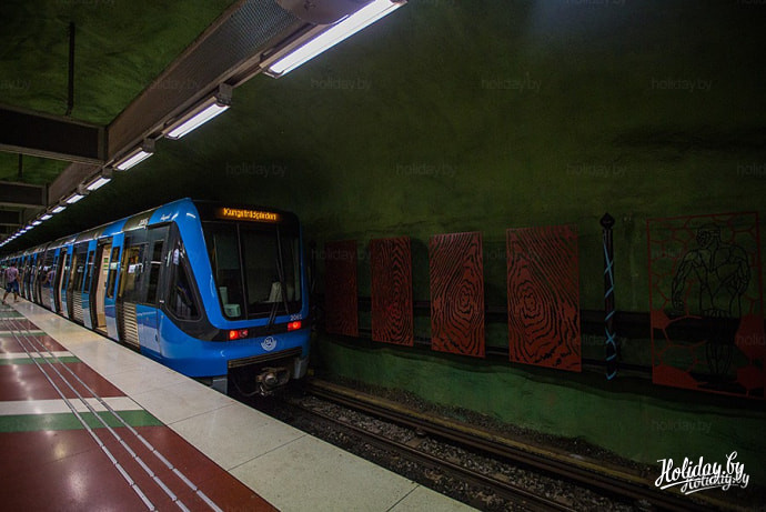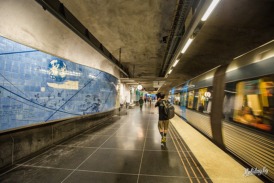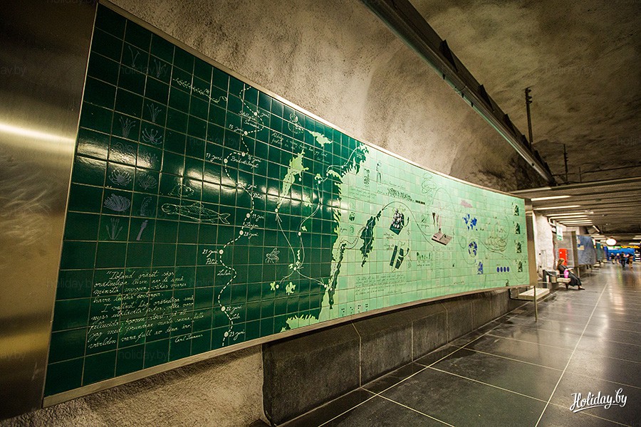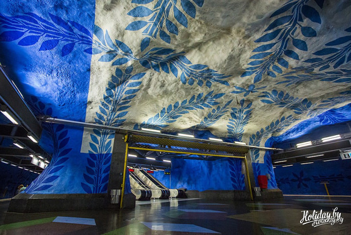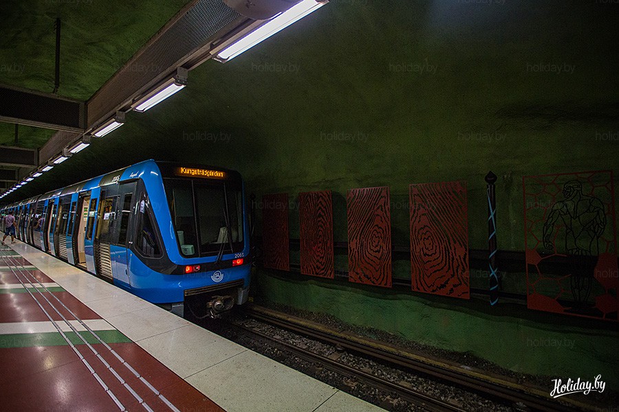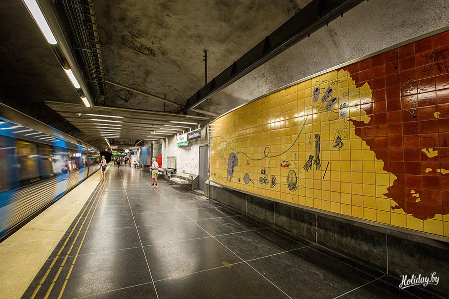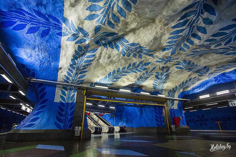 T-Centralen. Уникальная двухэтажная станция. На каждый этаж прибывают поезда обеих линий, причём, движущиеся в противоположных направлениях. Разрисована орнаментальным рисунком «голубая лоза».