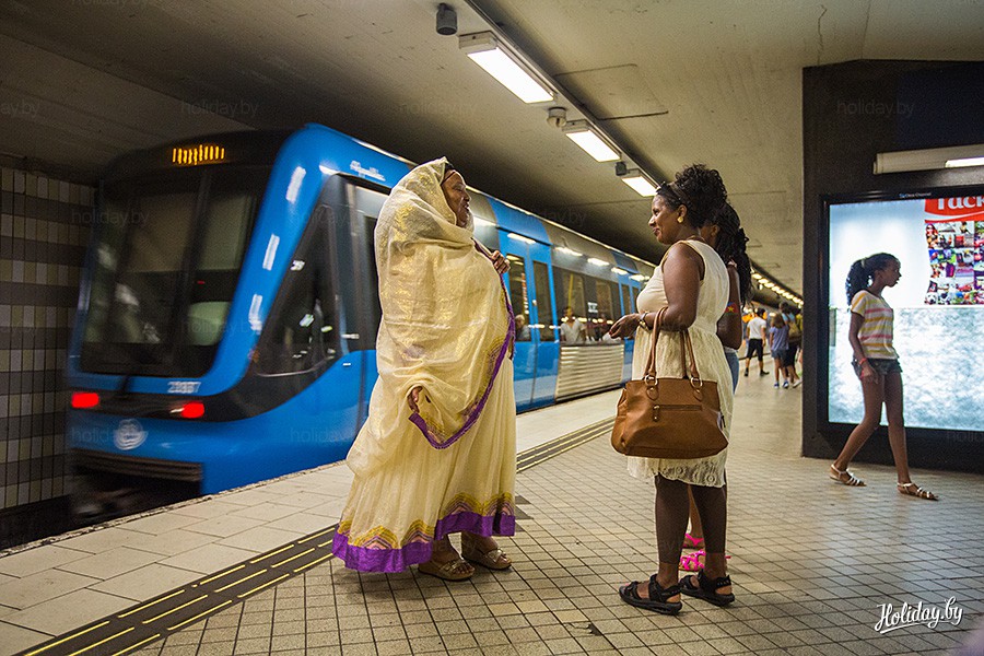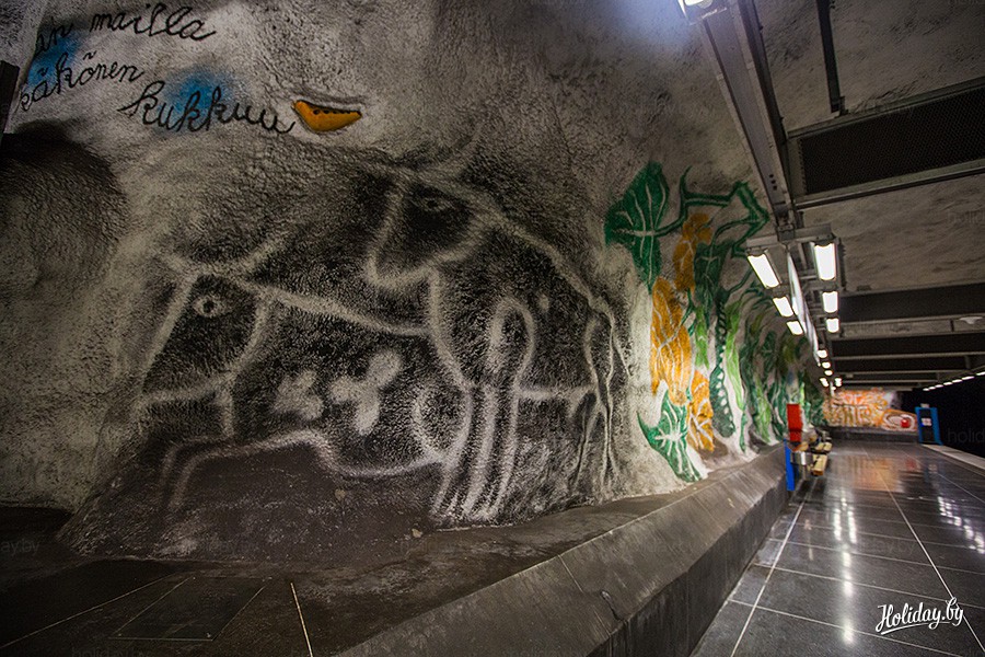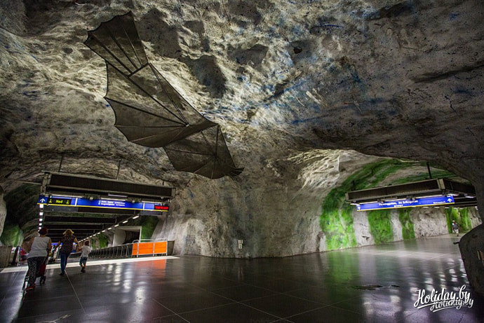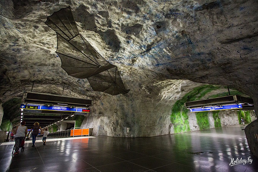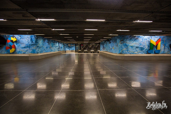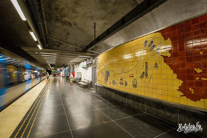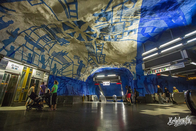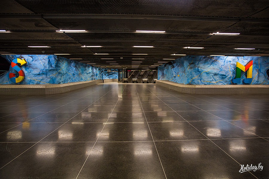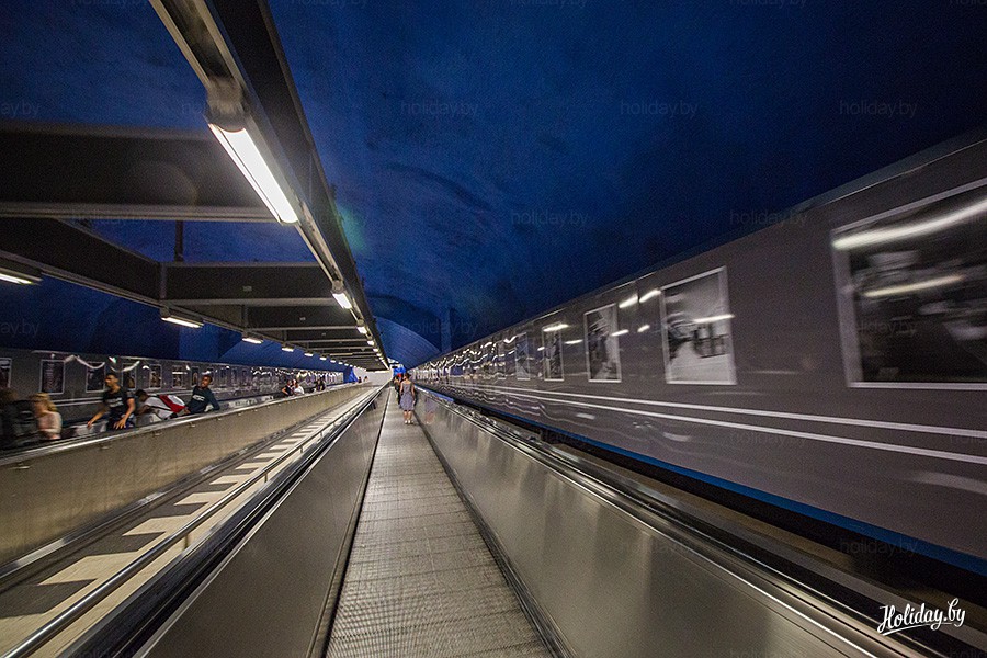 T-Centralen. Уникальная двухэтажная станция. На каждый этаж прибывают поезда обеих линий, причём, движущиеся в противоположных направлениях. Разрисована орнаментальным рисунком «голубая лоза».