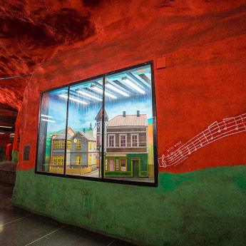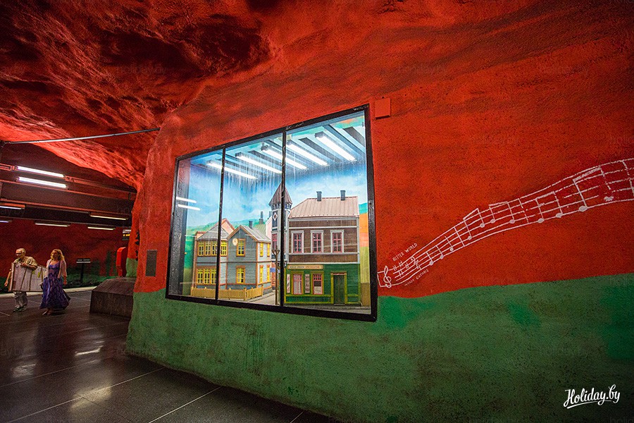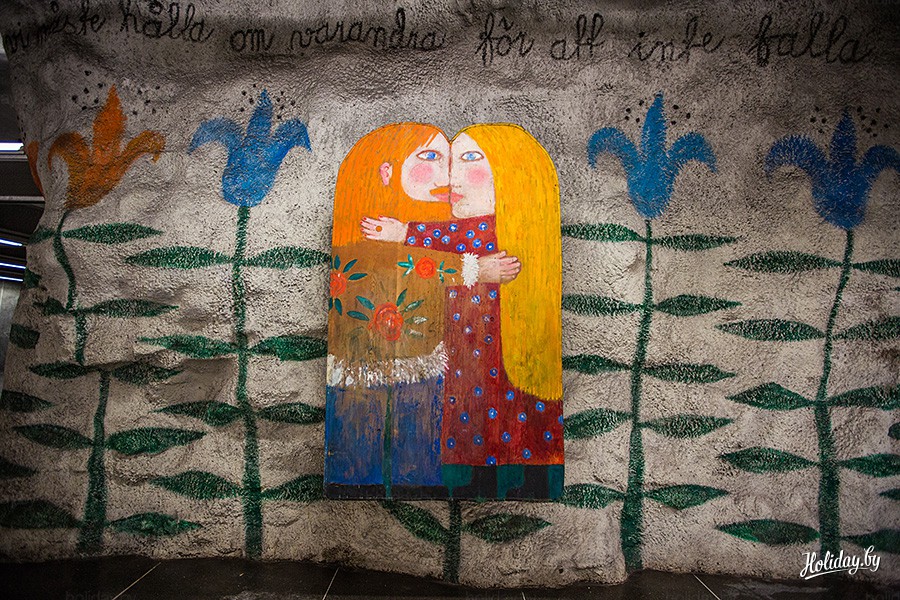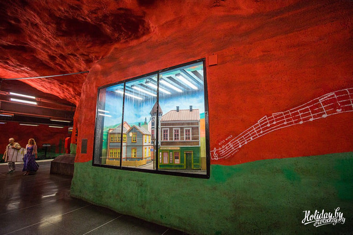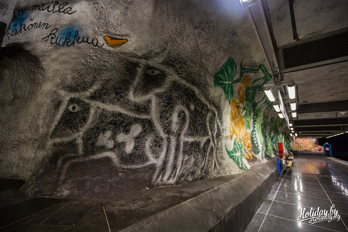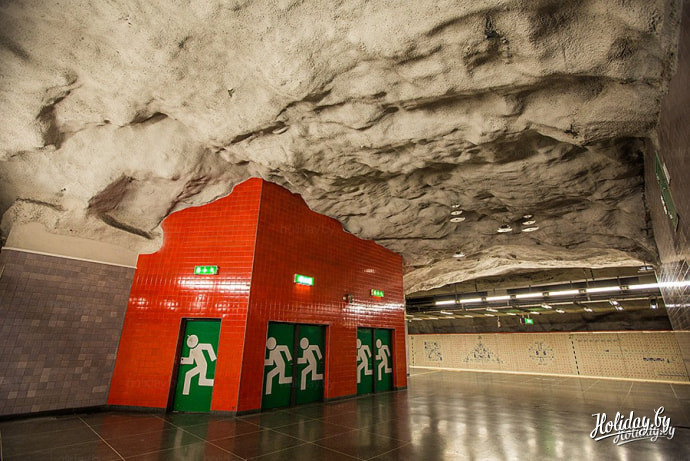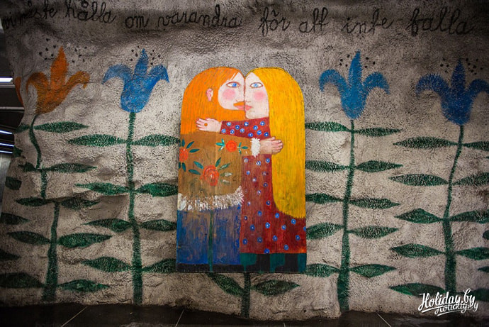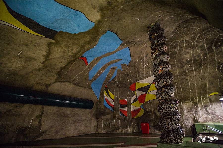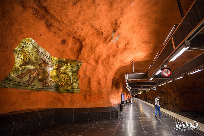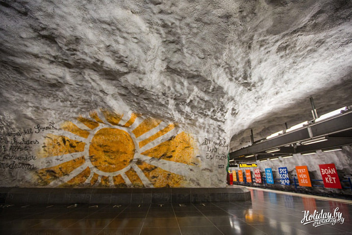 Stadion. Первая «пещерная» станция в метро Стокгольма. Здесь можно сделать самую неожиданную фотографию в зимнем Стокгольме. Даже если снежные бури бушуют на улице, вы можете здесь найти убежище среди цветов и яркой радуги.