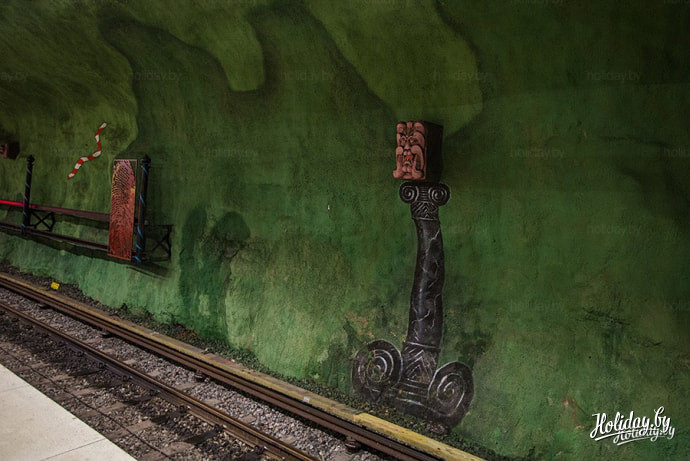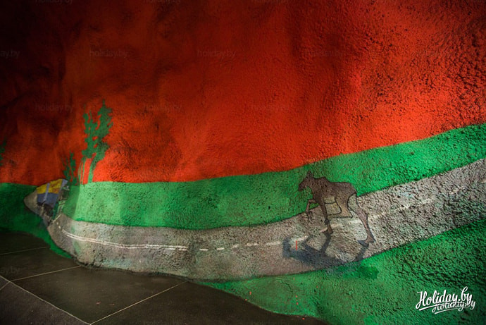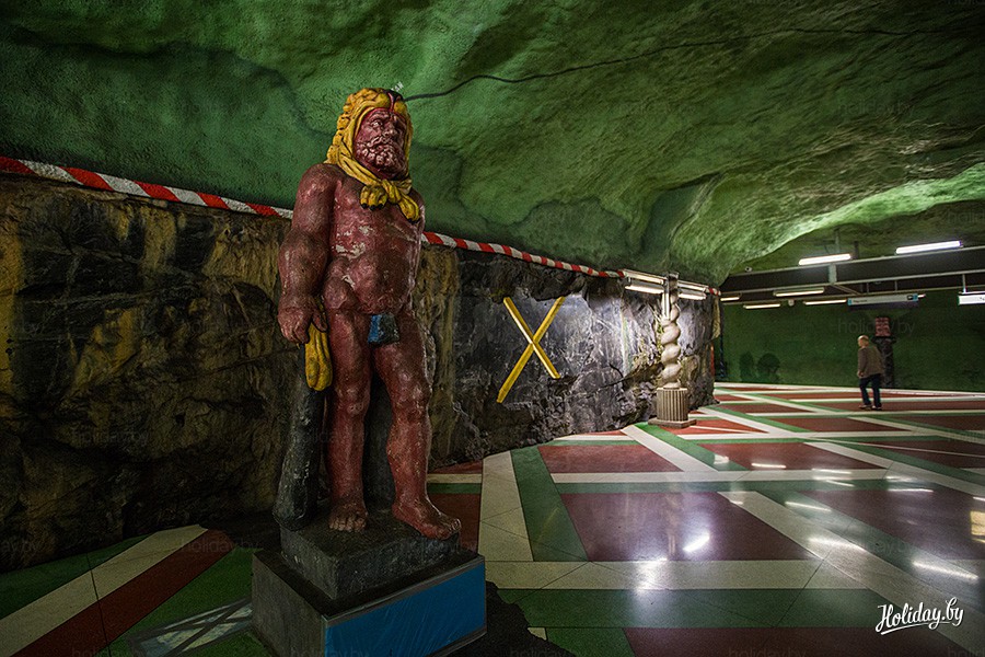 Kungsträdgården. «Королевский сад». Станция оформлена наскальной живописью в стиле «пещера горного короля». А вот и сам хозяин станции — статуя краснокожего мужчины, который олицетворяет бога войны и живёт в этой пещере.